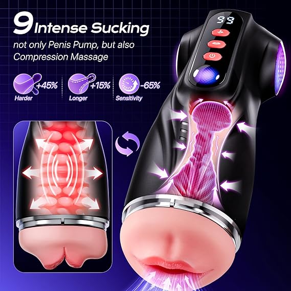 - 9 Vibrating & 9 Sucking Male Masturbator: Take control of you with 9 powerful suction and 9 intense vibration modes, from teasing pulses to deep, rhythmic contractions, find the perfect mix that matches your rhythm and intensity. Mens sex toys to bring you a fully immersive experience. LCD display on the penis pump sex machine screen makes it easy to remember your favorite modes. Gift sets & sex kits