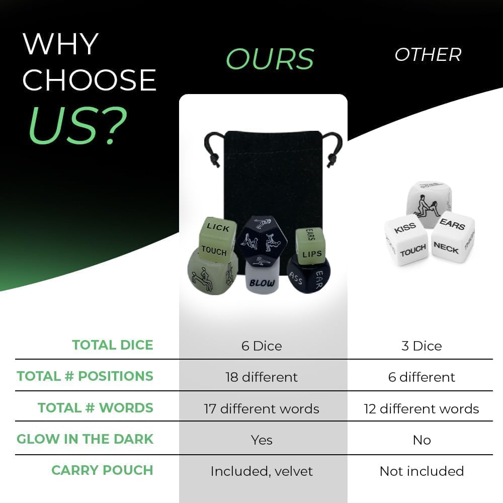 - 🌟 GLOW IN THE DARK: 3 of the dice glow in the dark for lights-out foreplay, two dices for warm-up, and one for positions.